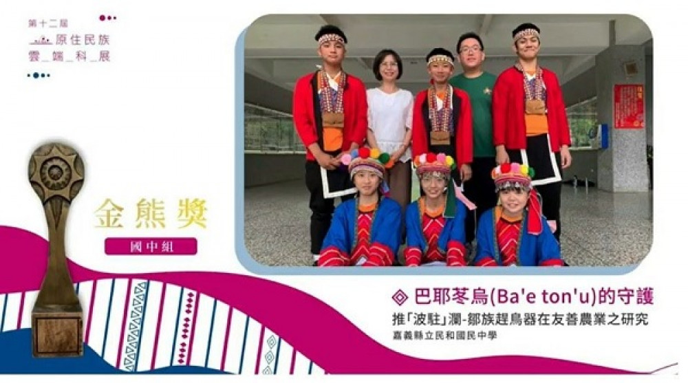 嘉義縣立民和國中今年以「推『波駐』─鄒族趕鳥器在友善農業之研究」榮獲第12屆原住民族雲端科展全國國中組第一名金熊獎,嘉義縣教育處代理處長李美華表示,這項科展作品結合鄒族與泰雅族智慧,探討部落傳統趕鳥器的共振駐波現象,兼具科學與原民文化價值,從全國91件作品中脫穎而出,感謝學校不遺餘力推動校內科學與原民文化教育,期待未來培育更多原住民科學人才