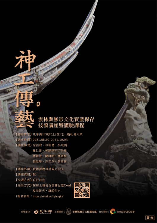 文化觀光處長陳璧君表示,為讓更多民眾參與,及對傳統工藝有更深體會,除規劃4場線上技藝傳承教學、6場工藝與表演藝術體驗課程外,另設計5場「跟著藝師看藝術」文化之旅,由工藝師在創作的工藝作品現場,親自講授當年創作理念、過程與工法,讓民眾體驗精緻的傳統藝術,進入到歷史文化的迴廊,傾聽傳統文化工藝或表演在歷史中原本的面貌。導覽結束後,執行單位提供工藝材料讓民眾DIY,在工藝師傳授點撥下,創造專屬自己的作品。