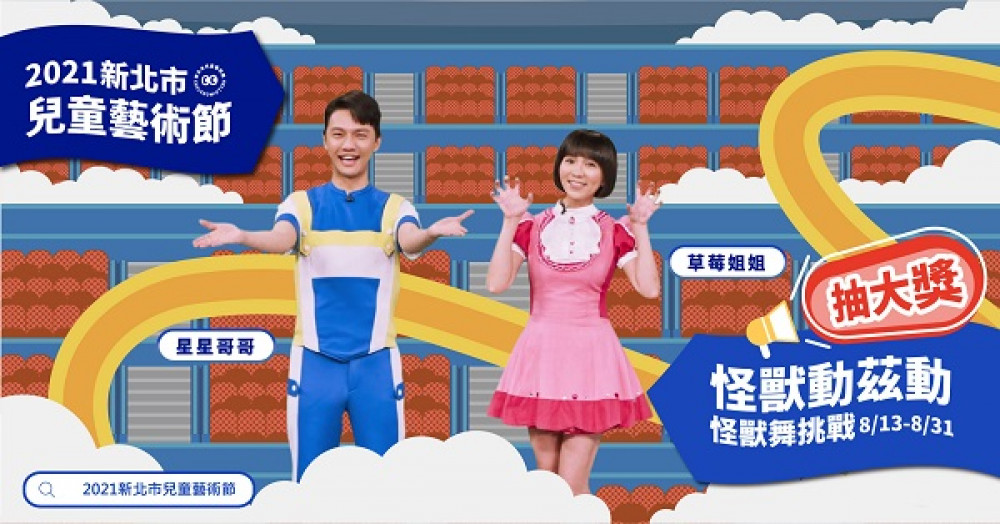 暑期最大兒童盛事之一的新北市兒童藝術節,今年首度改為線上舉辦,8月13日全面上線,主題曲〈怪獸Give Me Five〉搶先曝光,歌曲搭配年度主題「怪獸競技場」,將各種運動項目納入歌詞,為10月舉辦的全國運加油打氣,同時首創怪獸舞,由YOYO家族的草莓姐姐,及星星哥哥帶領大小朋友一起跳,一起舞動健康得大獎。