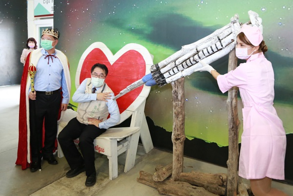 鹽雕展館內以漂流木製作時下最夯的針筒,作品名稱「一臂之力」,鼓勵大家儘快施打疫苗,同時2020展館作區「鹹鹹在家」重新整理佈置,以鹽打造的洗手台,提醒大家勤洗手、還有守護台灣的醫護英雄們「臺灣加油」等。