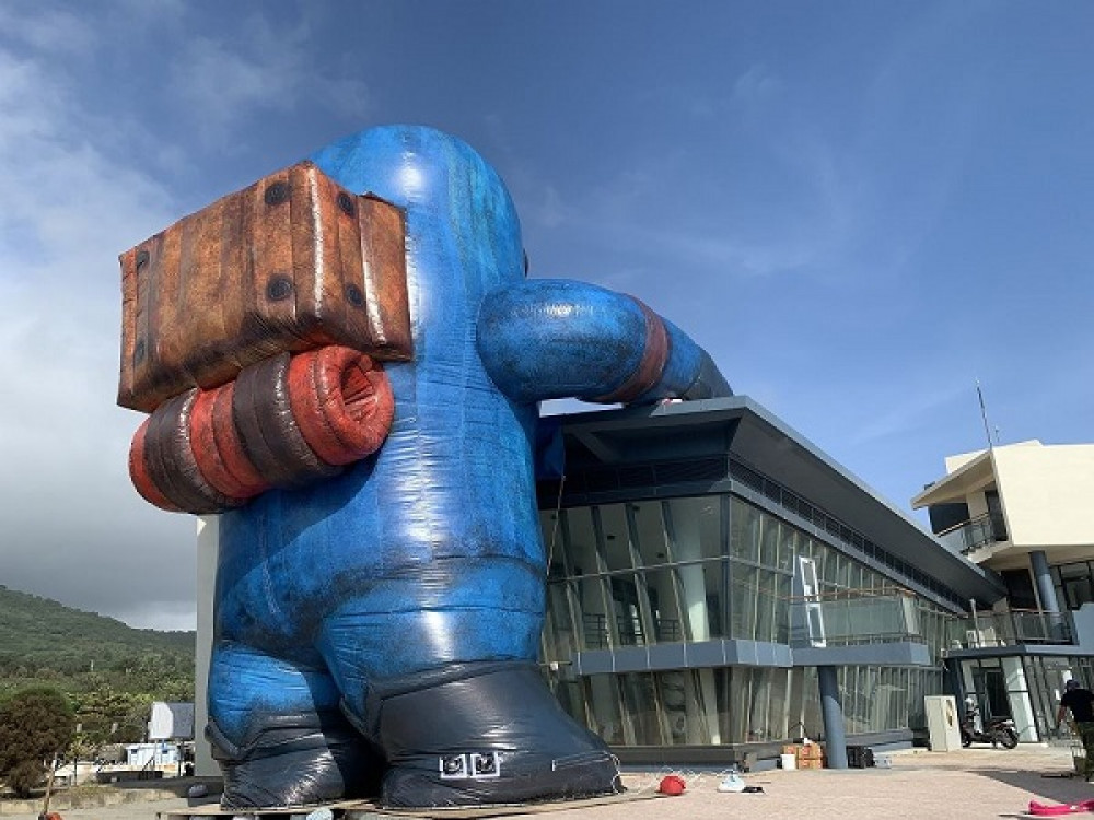 傳播暨國際事務處指出, 「春江獸月夜-阿咧特展」展出水墨畫18件、立體雕塑20件,最顯目的,就是佔據看海美術館屋頂的春江獸。在阿咧的創作想像中,它來自海底,在一個花好月圓之夜背上行囊,浮出海面來到屏東海口,雙手攀附環抱美術館站立,好奇探頭想知道美術館屋頂有什麼。14公尺高、重逾400公斤的春江獸,環抱著美術館,背後就是海口港,彷彿就是從海底爬出來的;民眾走上美術館屋頂吹風看海廊道,近距離和怪獸合影,超級有意思。