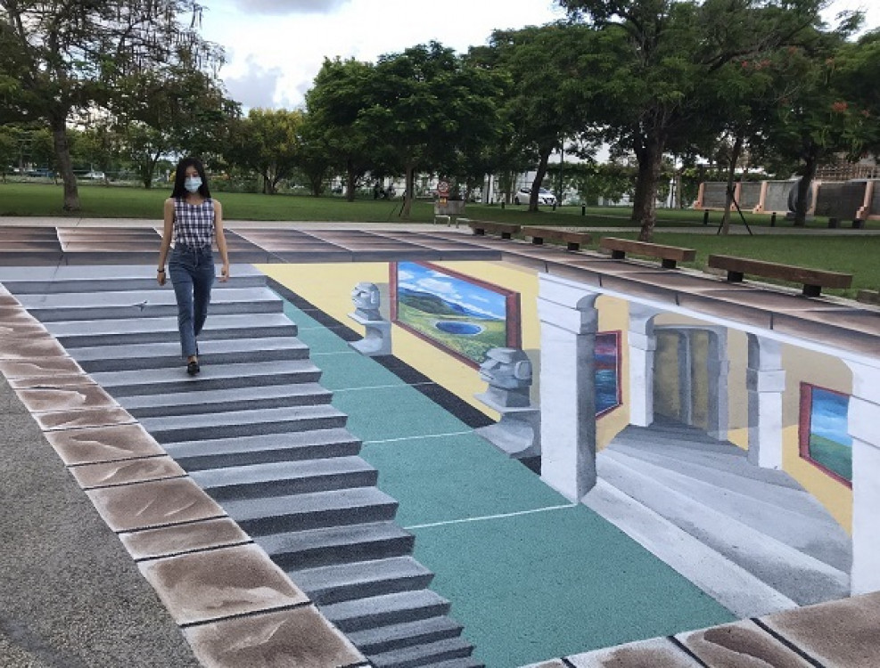 臺東美術館除大家熟悉的「山歌」、「海舞」展廳外,最近在廣場新增用特殊角度,才能走下去的地下藝廊。臺東縣文化處邀請專業3D彩繪家林志敏,以美術館建築發想,運用視覺將洗石子鋪面廣場改造,用畫筆3D構圖彩繪出向下探尋的旋轉梯和掛在牆上畫作,帶給民眾不同的視覺饗宴。